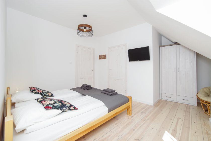 Kompaktowy pokój 4-osobowy. Skosy, drewniane belki nadają przestrzeni unikalnego klimatu. Pokój posiada prywatną łazienkę oraz dostęp do w pełni wyposażonej wspólnej kuchni.